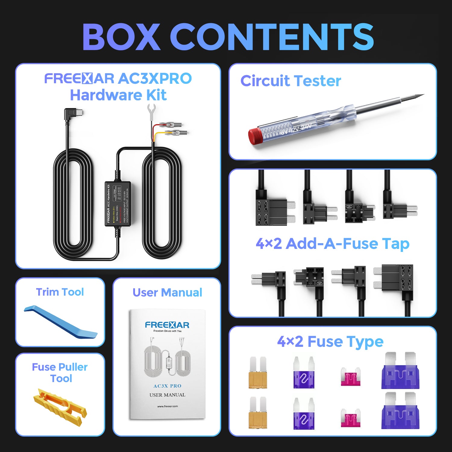 - 【Easy Installation】This ACC hardwire kit includes 4 fuse types (Standard ATO/ATC, Mini ATM, Micro2, and Low-Profile Mini) for broad vehicle compatibility, along with a circuit tester and all required accessories. It also comes with clear installation videos and a detailed manual. No cigarette lighter needed; hidden wiring keeps your interior neat and tidy.