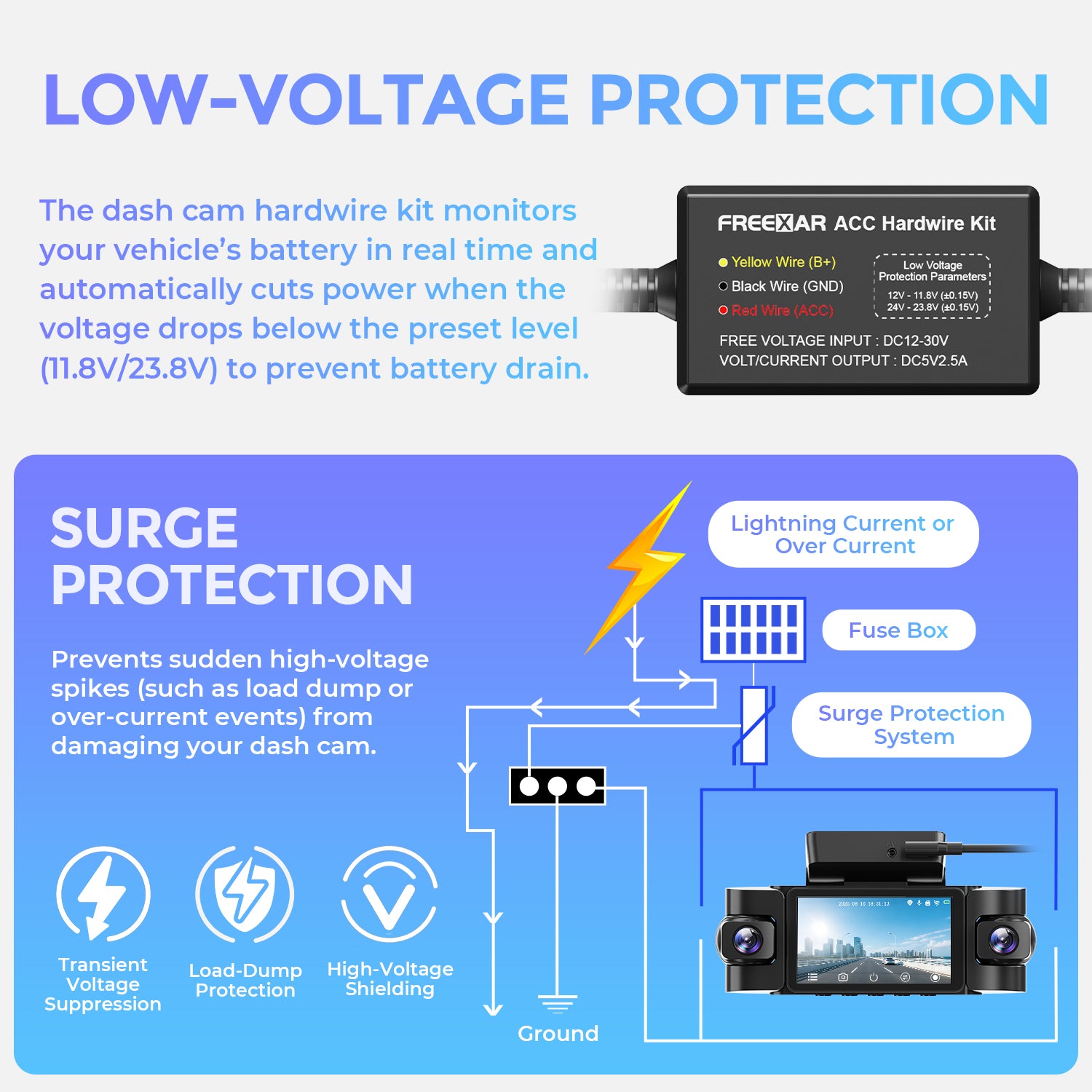 - 【Low-Voltage Protection】The dash cam hardwire kit monitors your vehicle’s battery in real time and automatically cuts power when voltage falls below 11.8V (12V systems) or 23.8V (24V systems). This prevents battery drain and protects your vehicle during extended parking.